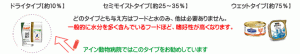 ほとんどの飼い主様は市販のキャットフードを利用されていると思います。市販されているキャットフードは下記の表のように3種類あります。たくさんのメーカーからそれぞれのタイプが市販されています。市販のフードは嗜好性の高いものから猫の年齢や症状などに合わせて製造された製品まで、飼い主様にとっては大変便利になっています。しかし中には嗜好性だけで猫に必要な栄養のバランスが良くないものや長期的に与えるといけないものもあります。飼猫にはどのフードがいいか、かかりつけの動物病院に相談されるのもいいでしょう。